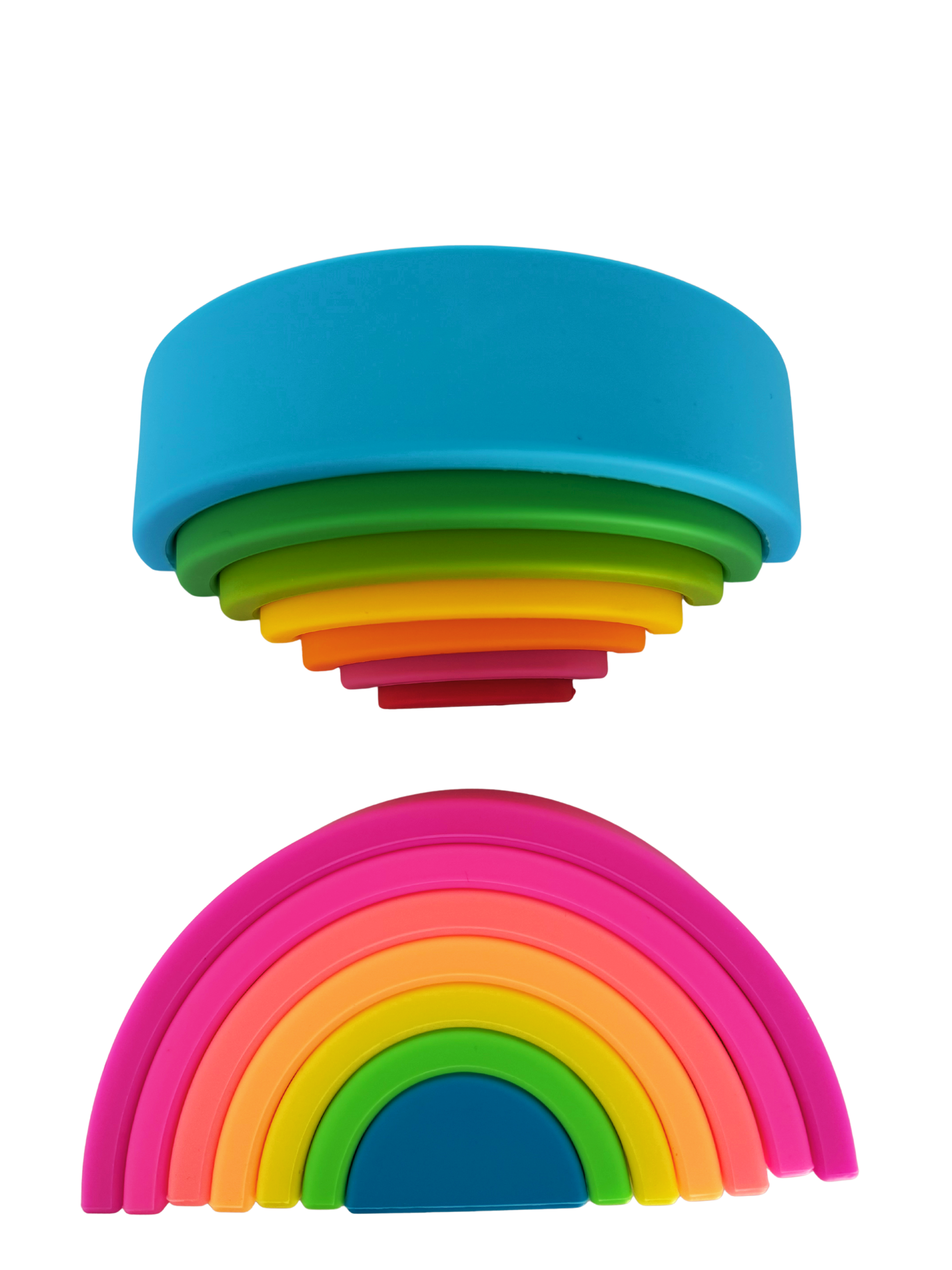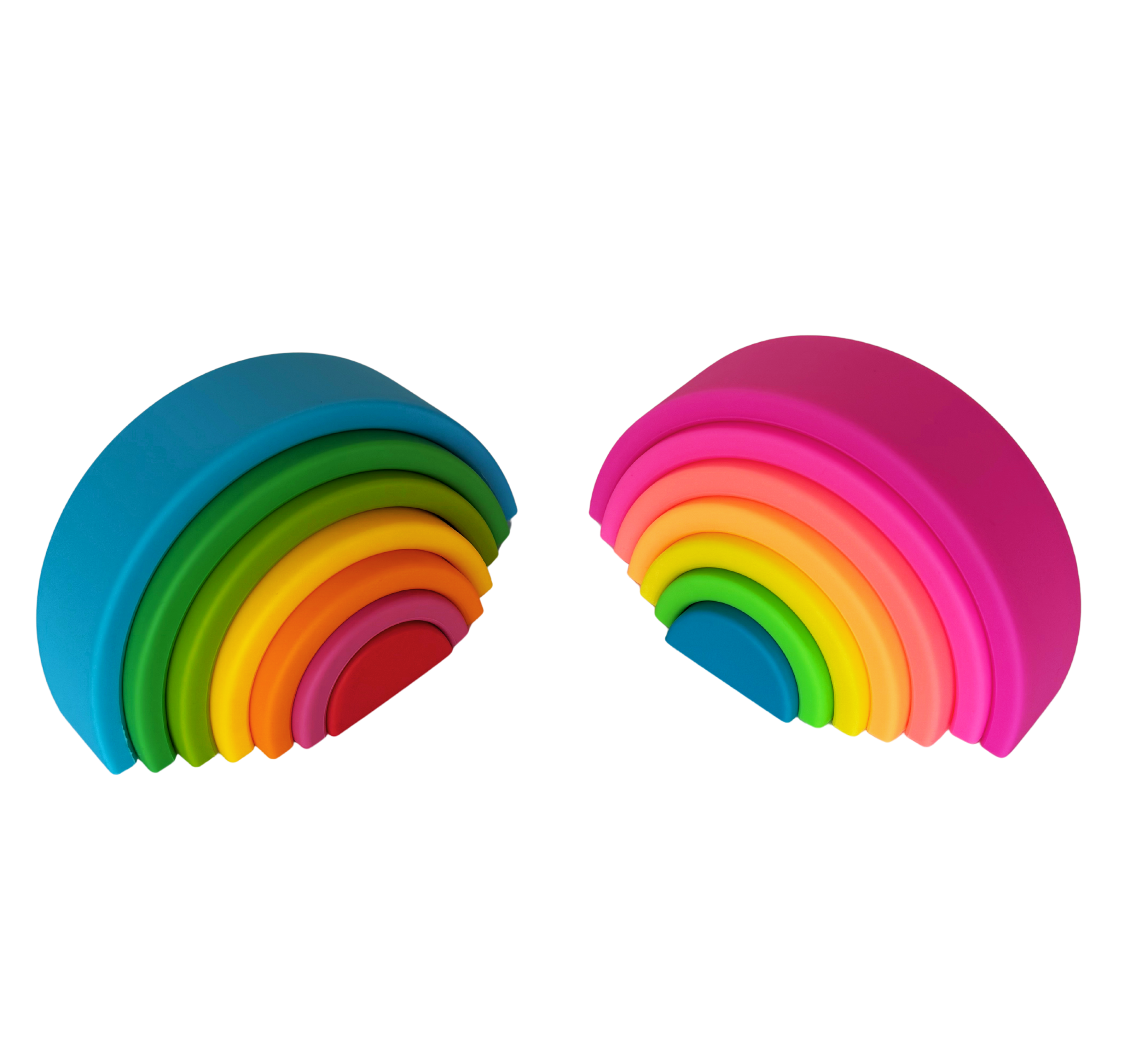 Our 7-Layer Silicone Rainbow Stacking Toy comes in two colour palettes: a soft pink gradient with seven dreamy shades, and a calming blue version with seven soothing tones.